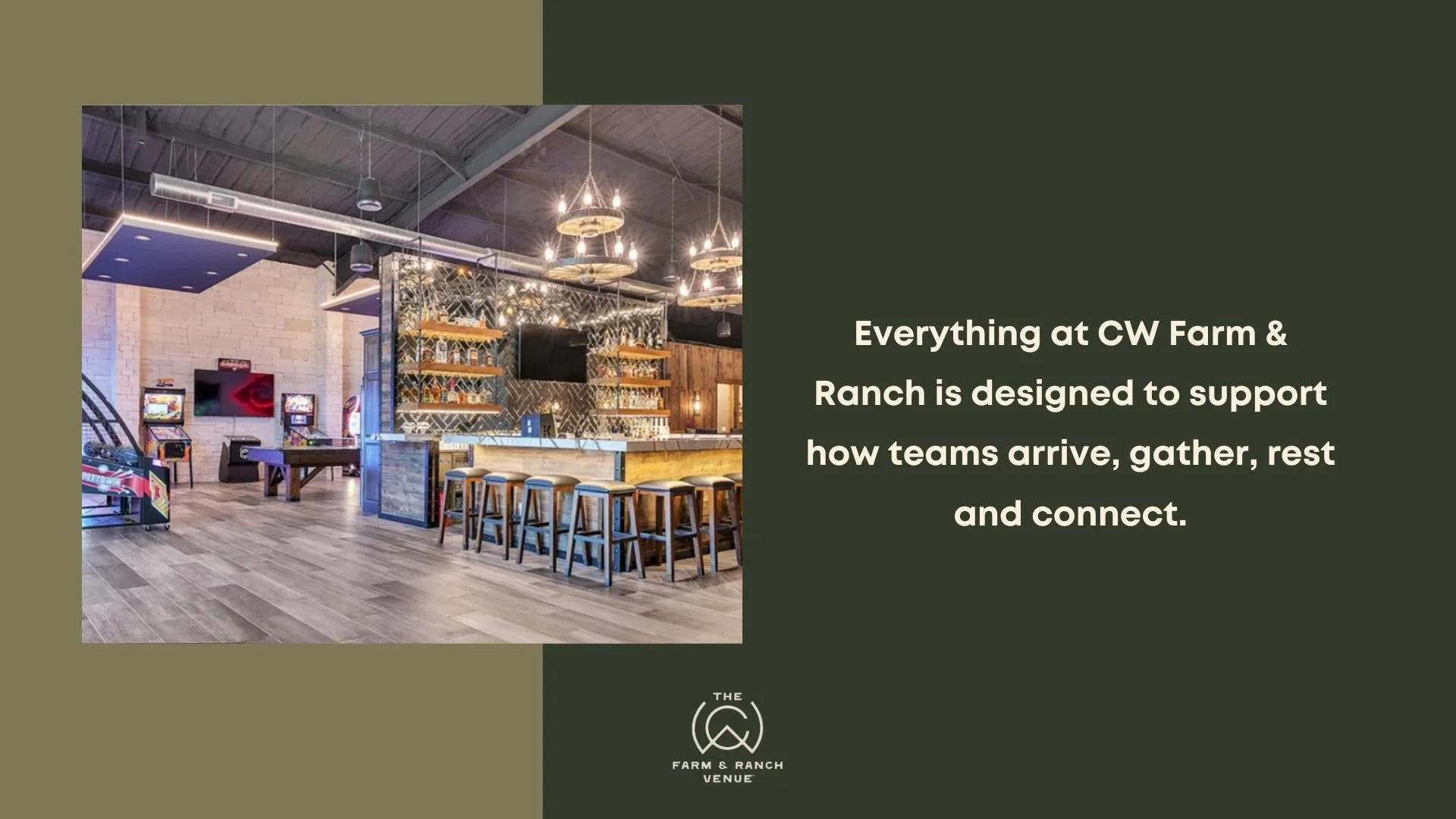 CW Farm & Ranch is designed to host large groups across the property. Spaces are spread out, not stacked. Teams can gather, break into smaller groups and come back together without feeling boxed in.